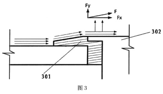 通過液體介質流過由保護套301形成的坡面進行導流,可以產(chǎn)生一個與坡面平行的力F,這個力可以分解為水平方向的力Fx和垂直方向的力Fy,與液體介質的流向垂直的力Fy可以減少電極頭302表面所承受的壓力,從而減少電極頭的磨損。坡面的傾斜角越大,垂直向上的力Fy也越大。但是,應該注意,坡面的傾斜角不能設置的過大,以免產(chǎn)生擾流,即,坡面的傾斜角的設置不要對液體介質的流速產(chǎn)生影響。通常,為了確保坡面的傾斜角度,保護套的頂部不高于電極頭的頂部。