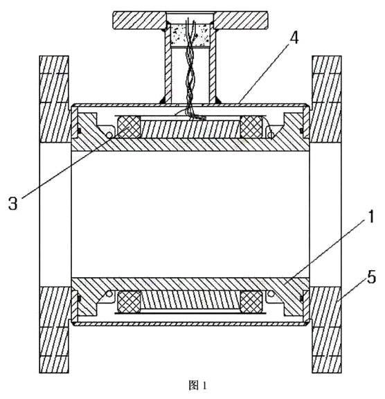所述導(dǎo)流管1上固定有一全封閉的密封罩4,其兩端各設(shè)有一電磁配對(duì)法蘭5,其管壁上設(shè)有兩個(gè)貫通其管壁的測(cè)量孔,每個(gè)測(cè)量孔對(duì)應(yīng)一個(gè)測(cè)量電極2,每個(gè)測(cè)量電極2的一端插入其對(duì)應(yīng)測(cè)量孔中,每個(gè)測(cè)量電極2的外周面與對(duì)應(yīng)測(cè)量孔的孔壁之間均用絕緣隔套隔離并密封,各測(cè)量電極2及各勵(lì)磁線圈3均罩設(shè)在密封罩4內(nèi),并各經(jīng)導(dǎo)線引出密封罩4;其特征在于:所述導(dǎo)流管1是一塑膠絕緣管體。