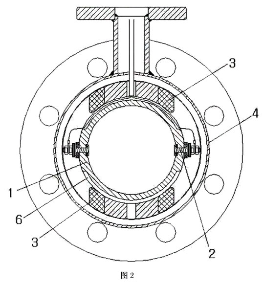 以下結(jié)合附圖說明對(duì)本發(fā)明的實(shí)施例作進(jìn)一步詳細(xì)描述,但本實(shí)施例并不用于限制本發(fā)明,凡是采用本發(fā)明的相似結(jié)構(gòu)及其相似變化,均應(yīng)列入本發(fā)明的保護(hù)范圍。如圖1-圖2所示,本發(fā)明實(shí)施例所提供的一種電磁流量計(jì)的無樹里測(cè)量頭,包括導(dǎo)流管1、測(cè)量電極2和勵(lì)磁線圏3,所述測(cè)量電極2和勵(lì)磁線圈3各有兩個(gè),沿導(dǎo)流管1的周向軸對(duì)稱交替固定在導(dǎo)流管管壁上;