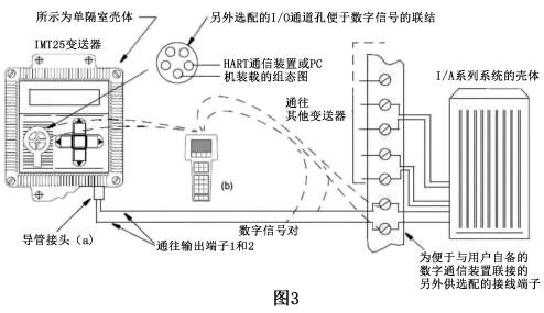 導管走向向下避免水分積聚在接線盒中。任何不用的導管開口都應加以悶塞。HART通信裝置或裝載在PC機上的組態器可以連接在變送器現場接線端到外部負載之間的任何位置,或連接到另外配供的IO孔口上。如圖3所示;
