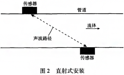直射式安裝時(shí),一組換能器安裝在管道的對側(cè),這種安裝方式超聲波聲束的聲程zui短,可以提高信號強(qiáng)度,當(dāng)管道和液體的聲導(dǎo)性能差時(shí),要考慮使用直射式安裝。如圖2所示。