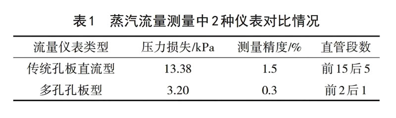 例如,在某聚丙烯生產(chǎn)項(xiàng)目中,需要對(duì)丙烯脫氣塔再沸器中的蒸汽進(jìn)行流量測(cè)量。具體測(cè)量中,該企業(yè)ZUI初選擇的是傳統(tǒng)孔板節(jié)流形式的流量?jī)x表,但是因?yàn)楸敬雾?xiàng)目中對(duì)于工藝精度有著非常高的控制要求,需將精度控制在1%以?xún)?nèi),同時(shí)應(yīng)盡可能將測(cè)量過(guò)程中的壓力損失降低,且對(duì)于空間布局也具有一定的限制,在這樣的情況下,傳統(tǒng)孔板節(jié)流形式的流量?jī)x表并不能滿足該項(xiàng)目的實(shí)際測(cè)量需求。基于此,企業(yè)便對(duì)原來(lái)的方案進(jìn)行了優(yōu)化改進(jìn),選擇用多孔孔板形式的流量?jī)x表來(lái)替代傳統(tǒng)孔板節(jié)流形式的流量?jī)x表。借助于相應(yīng)的軟件來(lái)進(jìn)行了流量?jī)x表的設(shè)計(jì)計(jì)算,對(duì)傳統(tǒng)孔板節(jié)流形式的流量?jī)x表和更換之后的多孔孔板形式流量?jī)x表進(jìn)行了對(duì)比,蒸汽流量測(cè)量中2種儀表對(duì)比情況見(jiàn)表1。