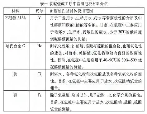 電磁流量計的測量電極是與工藝介質直接接觸的**金屬材料,其作用是與導線連接將測量管中產生的微弱感應電動勢傳輸到轉換器中的檢測單元。由于電磁流量計的電極部分處于工作磁場中,為防止磁力線在電極上集中,電極材料必須使用非導磁的金屬材料;并根據工況介質對金屬材料的腐蝕速率(mm)a,即毎年被腐蝕掉的金屬厚度)來確定不同的工況介質選擇不同的金屬材料。下面通過圖表一的方式介紹在氯堿燒堿工序中常用的幾種電極材料及其使用范圍。