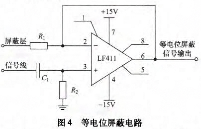 電極之間的感應電壓是非常微弱的交變信號,而且包含各種噪聲干擾信號,因此為有效采集感應電壓信號,檢測信號必須進行信號處理。信號處理模塊主要包括等電位屏蔽電路、前置放大電路、濾波電路、可編程放大電路以及釆樣保持電路幾個部分。為保證外部電磁場不對傳輸信號的信號線產生干擾,采用屏蔽電纜輸出電極上的微弱信號。然而在屏蔽電纜屏蔽層和信號線之間存在著分布電容和分布電阻,其中分布電容一般高于放大器輸入電容,分布電阻幾乎等于放大器輸人電阻,這給信號的檢測帶來很大的影響。采用等電位驅動屏蔽電纜電路可以避免屏蔽電纜分布電容和分布電阻影響,如圖4所示