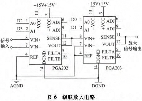 通過調整電阻R1完成即可設置增益范圍為1-10000倍的調整。經前置放大電路后,電極之間的電動勢由差動信號變為單端信號。因測量電路存在噪聲干擾,前置放大電路輸出信號中存在直流偏置和基線漂移,同時還存在高頻尖峰噪聲,因此需采用濾波電路對雜散信號進行抑制。設計采用具有低輸入失調電壓、低輸入偏置電流、高開環增益和高共模抑制比的OP07組成二階壓控電壓源型高通濾波(截止頻率0.034Hz)和低通濾波(截止頻率72Hz)級聯電路。濾波電路輸出信號幅度較小,因此需經次級放大電路提高增益。設計采用可編程儀表放大器PGA202與PGA203組成的級聯放大電路,如圖6所示。