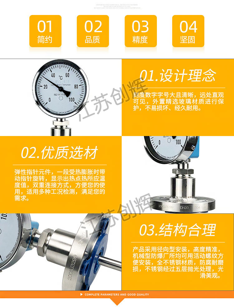 雙金屬溫度計是用繞成螺旋形的熱雙金屬片作感溫元件,并將它裝在保護管內,一端固定,另一端連接在一根細軸上,軸端裝有指針,當溫度發生變化時,感溫元件的自由端隨即轉動,通過細軸帶動指針產生角位移,在標度盤上指示出溫度的變化。我公司***早參與國產系列雙金屬溫度計的設計和標準制定工作。雙金屬溫度計是一種適用于測量中低溫的現場檢測儀表,可用來直接測量氣體、液體和其它物質的溫度,具有讀數清晰,堅固特點。