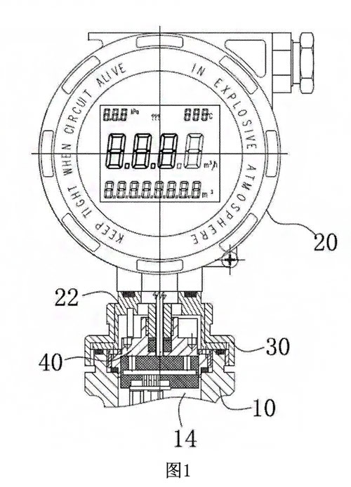 參見圖2,還包括固定連接表頭20的表頭聯接座22、聯接蓋30、傳感器座40和聯接頭12,殼體10內設有流體通道14,殼體10上設有與流體通道14相通的連接口,聯接頭12為連接口邊緣向外延伸的一圏凸起,傳感器座40為法蘭結構并設于聯接頭12內,表頭聯接座22為蓋結構并倒扣設于聯接頭12和傳感器座40上方,表頭聯接座22與聯接頭12的外表面分別設有外螺紋,聯接蓋30設有與外螺相對應的內螺紋,聯接蓋30分別與表頭聯接座22和聯接頭12螺紋連接,并使表頭聯接座22與聯接頭12緊密連接,在傳感器座40上固定設有防轉動片42,在表頭聯接座22內固定設有與防轉動片42相對應的防轉動軸44,還包括電路板52和與電路板52電性連接的差壓傳感器50,差壓傳感器50設于流體通道14內,電路板52設于差壓傳感器50上方并固定連接在傳感器座40下方,傳感器座40中央設有通孔54,電路板52上設有電線接頭并連接有電線,電路板52通過電線穿過通孔54與表頭20連接。