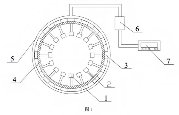 根據附圖1和圖2,本實用新型一種十六電極電磁流量計,包括流速檢測頭1、連接頭2、連接法蘭3、測量信號通道5、單片機6和表頭。表頭為上位機7,流速檢測頭是由一個十六電極系統和一個準勻強磁場構成,流體流速采用16個多電極多角度進行檢測,通過測量信號通道5將數據送到單片機6,單片機6對數據進行處理計算,ZUI后輸出到上位機7顯示出所測流量值。十六電極系統分為八對極,在工業管道上呈360°等分角度分布,八對極的磁場方向與準勻強磁場垂直。