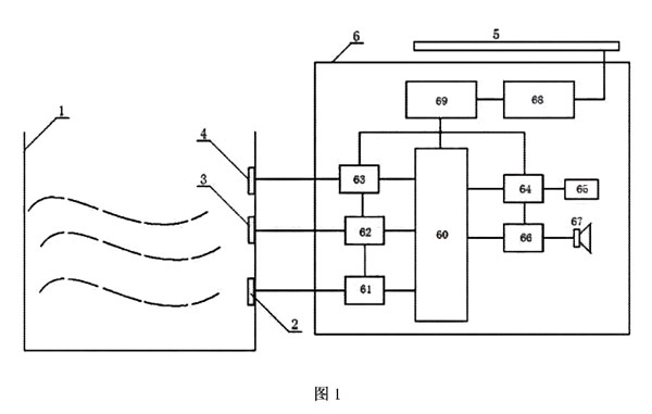 參照圖1,一種鉆井泥漿儲罐液位報警裝置,包括泥漿儲罐1、傳感器2-4、報警器6和太陽能電池5,所述泥漿儲罐1一側的內壁上,自下而上順次設有第 一傳感器2、第 二傳感器3和第 三傳感器4,所述報警器6包括蓄電池68、穩壓電路69、中央處理器60、第 一轉換電路61、第 二轉換電路62、第 三轉換電路63、隔離電路64、網絡接口65、放大電路66和喇叭67;所述第 一傳感器2通過第 一轉換電路61與中央處理器60的第 一輸入端相連接,第傳感器3通過第 二轉換電路62與中央處理器60的第 二輸入端相連接,第 三傳感器4通過第 三轉換電路63與中央處理器60的第 三輸入端相連接,中央處理器60的一輸出端通過隔離電路64與網絡接口65相連接,中央處理器60的另一輸出端通過放大電路66與喇叭67相連接,所述太陽能電池5與蓄電池68相連接,蓄電池68通過穩壓電路69與中央處理器60、第 一轉換電路61、第 二轉換電路62、第 三轉換電路63、隔離電路64及放大電路65相連接。其中,所述第 一傳感器2、第 二傳感器3及第 三傳感器4均為壓電陶瓷片。所述中央處理器60為單片機電路或可編程控制器。